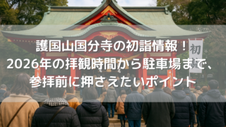 初詣 護国山国分寺の初詣情報!2026年の拝観時間から駐車場まで、参拝前に押さえたいポイント 久留米市宮ノ陣にある護国山国分寺は、聖武天皇の勅願によって建てられた国分寺の流れを汲む古刹です。聖武天皇の勅願に端を発する筑後国分寺の流れを汲む歴史ある名刹で、筑後三十三観音霊場第11番札所としても知られています。普段は地元に馴染んだ静かな... 2025.11.04 初詣