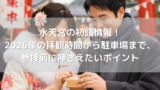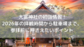| 参拝時間 | 12月29日~31日 9時~16時 12月31日 23時~1月1日 23時半 1月2日~5日 7時~21時半 ※2025年年始の情報です。変更になることもあるので、公式SNSでご確認ください。 |